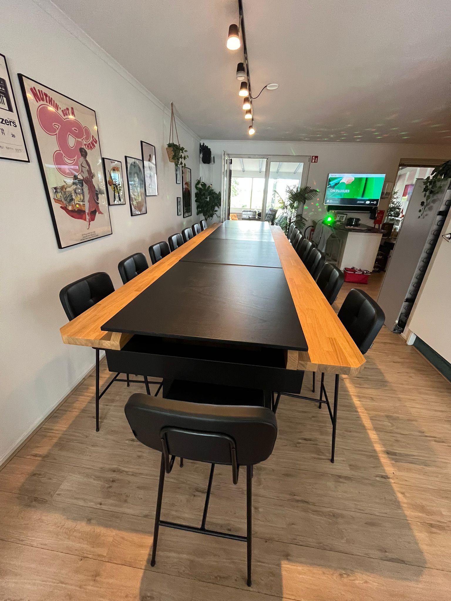 The Shuffly Shuffleboard bar is the perfect product for this, as it can be used multi purpose. It is a table with a game inside, and with the tabletop cover, the table can be used to have dinner on as well. This is needed as 16 people need to be able to eat and drink on this table. We delivered the custom height bar stools as well to deliver a full shuffleboard solution.