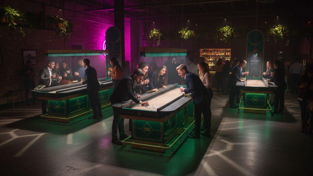 The Grand Shuffle is all about Competitive Socializing: enjoying great drinks, catching up with friends and family, and sliding pucks in a vibrant, high-energy environment. Brothers Horeca Groep deliberately chose shuffleboard over other social gaming concepts because of its accessibility for all ages and genders, strong food & beverage integration, and its ability to bring people together.